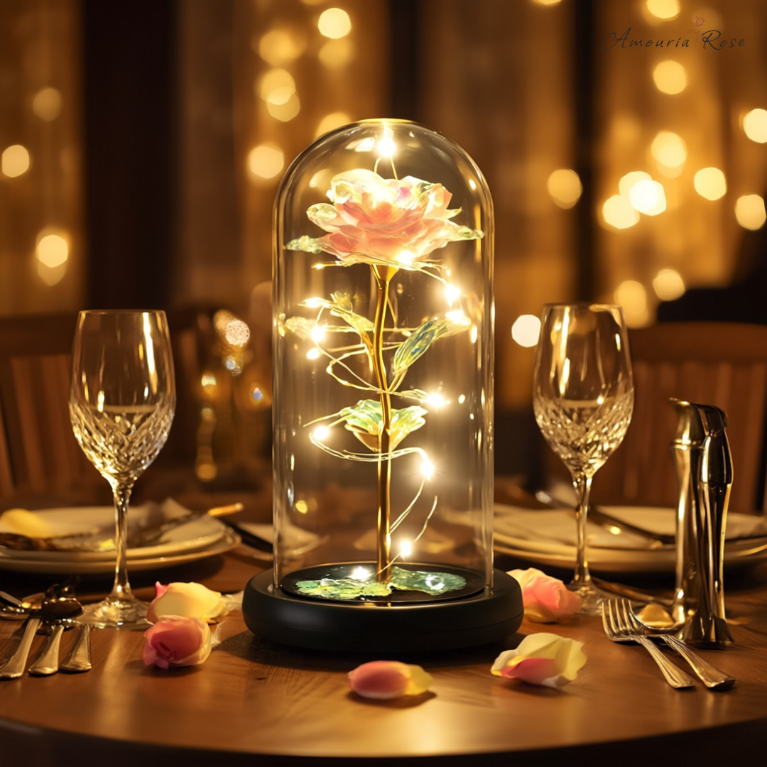 Dank der energieeffizienten LED-Lichter sorgt die Amouria Rose über viele Stunden für eine sanfte, warme Atmosphäre.
