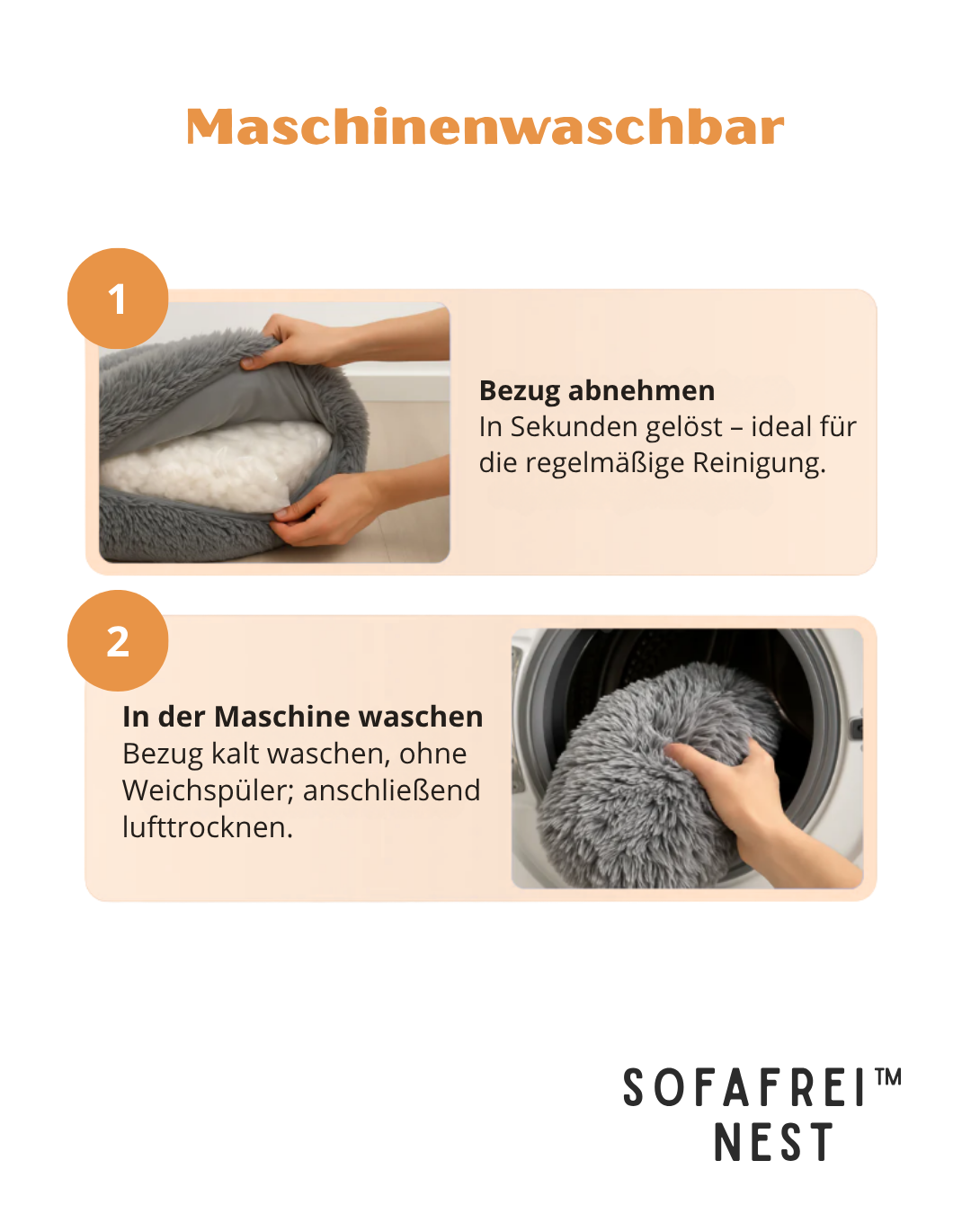 Bezug abziehen, Haare ausschütteln oder kurz absaugen. Kalt waschen ohne Weichspüler; anschließend lufttrocknen und kurz aufschütteln für Volumen.